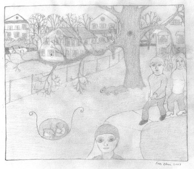 Three People on Path, Squirrels, Cat