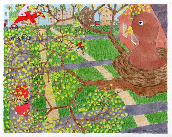 Bird in Nest, Bird in Sky, People and Cars on Sidewalk and Road