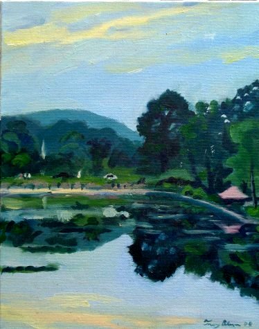 Pond, Hill, Cars, Trees and Pagoda