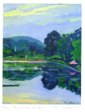 Pond, Hills, Cars, Trees, and Pagoda Print